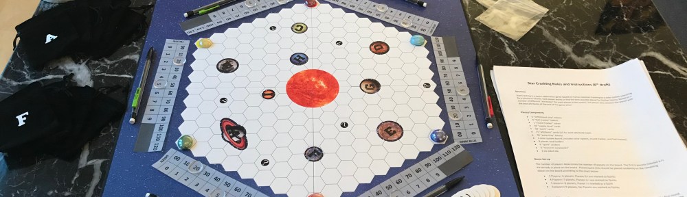 After almost a year since my first official Star Crashing playthrough, and a lot of big changes in my personal life (moving to a new place, starting a new job, getting married, that sort of stuff) I’m back on the board game developing horse! Next on my list: make more than one prototype so I can share my game with other interested parties. I put some more work into this version, using stickers and glue instead of trying to photoshop everything into a single low-res photo, and ended up with a pretty great result: